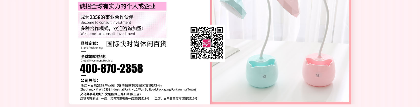 浙江文博日用品有限公司家居日用品企业,中国人文家居企业。公司旗下:浙江文博日用品有限公司、浙江文博日用品有限公司义乌分公司、绿灿国际贸易(上海)有限公司、文博与天喜、净派人家、2358(爱上我吧)共同组成文博家居日用品集群。2358, 品质至上,在设计,功能,品质,价值上坚持环保可持续发展的理念。从设计到您手中,2358关注您的生活需求!